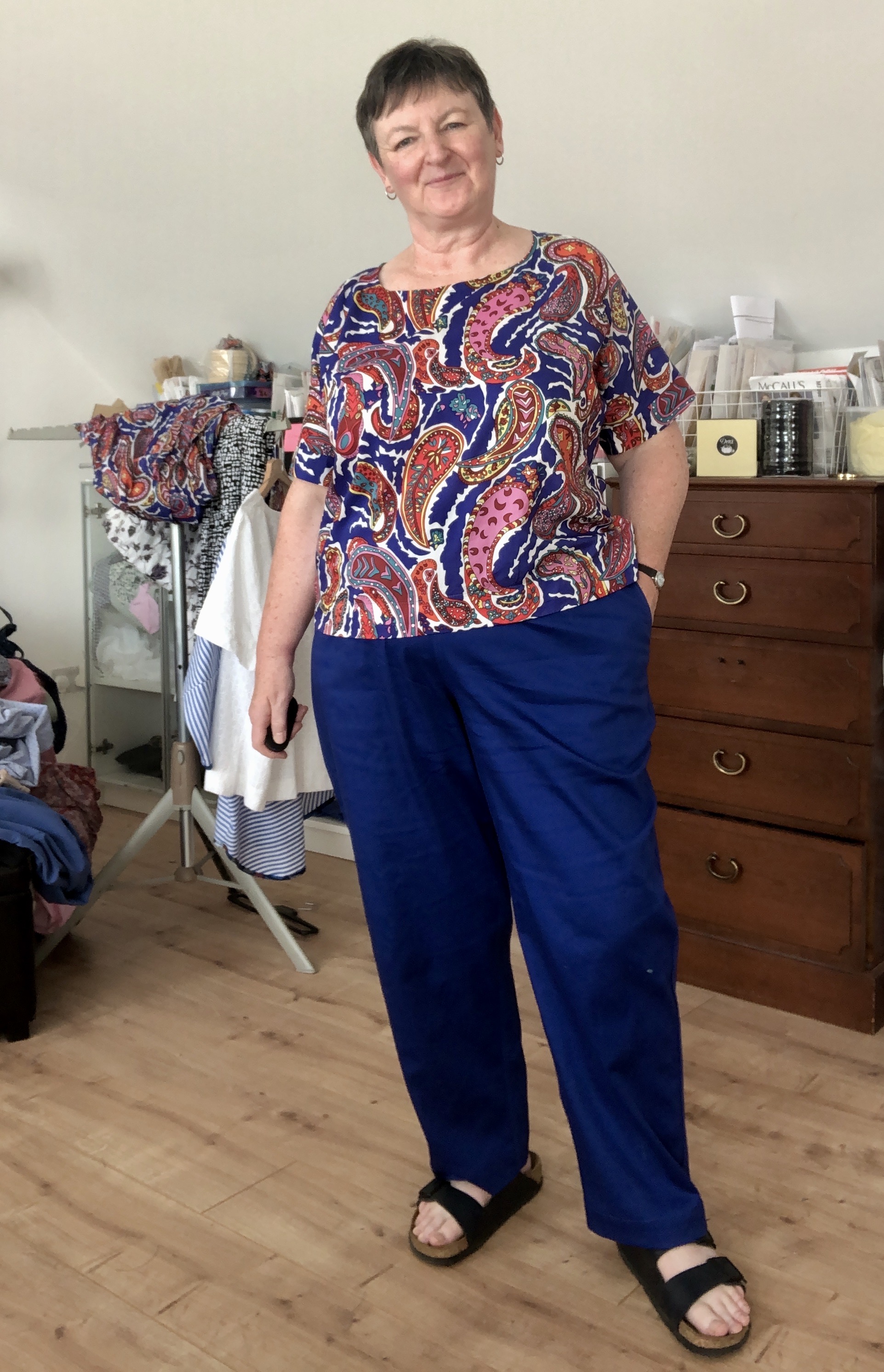 I thought I was making my second pair of Helen’s Closet (https://helensclosetpatterns.com/product/arden-pants/) Arden pants to go with the stripey top, but it’s my least favourite of the three here.