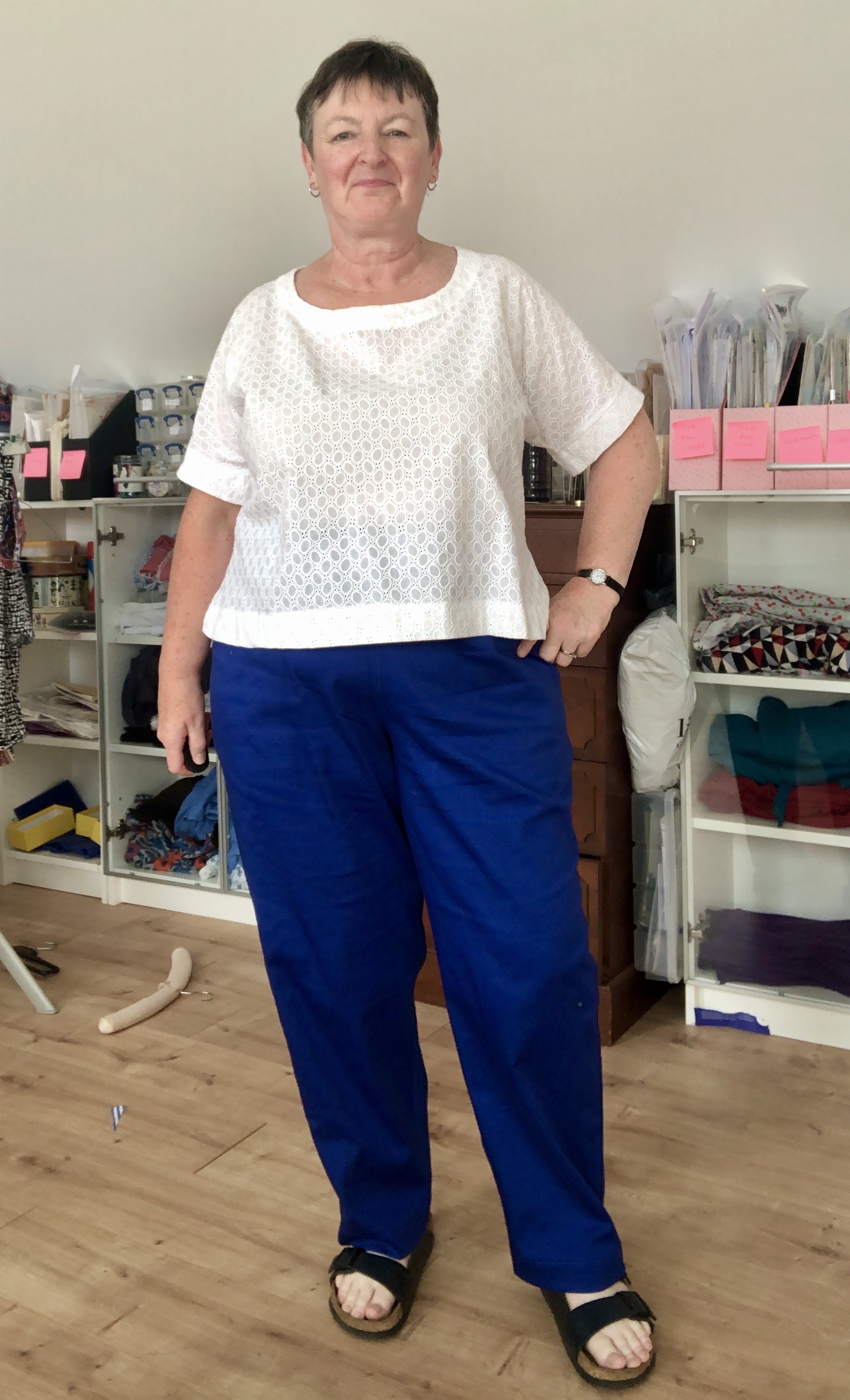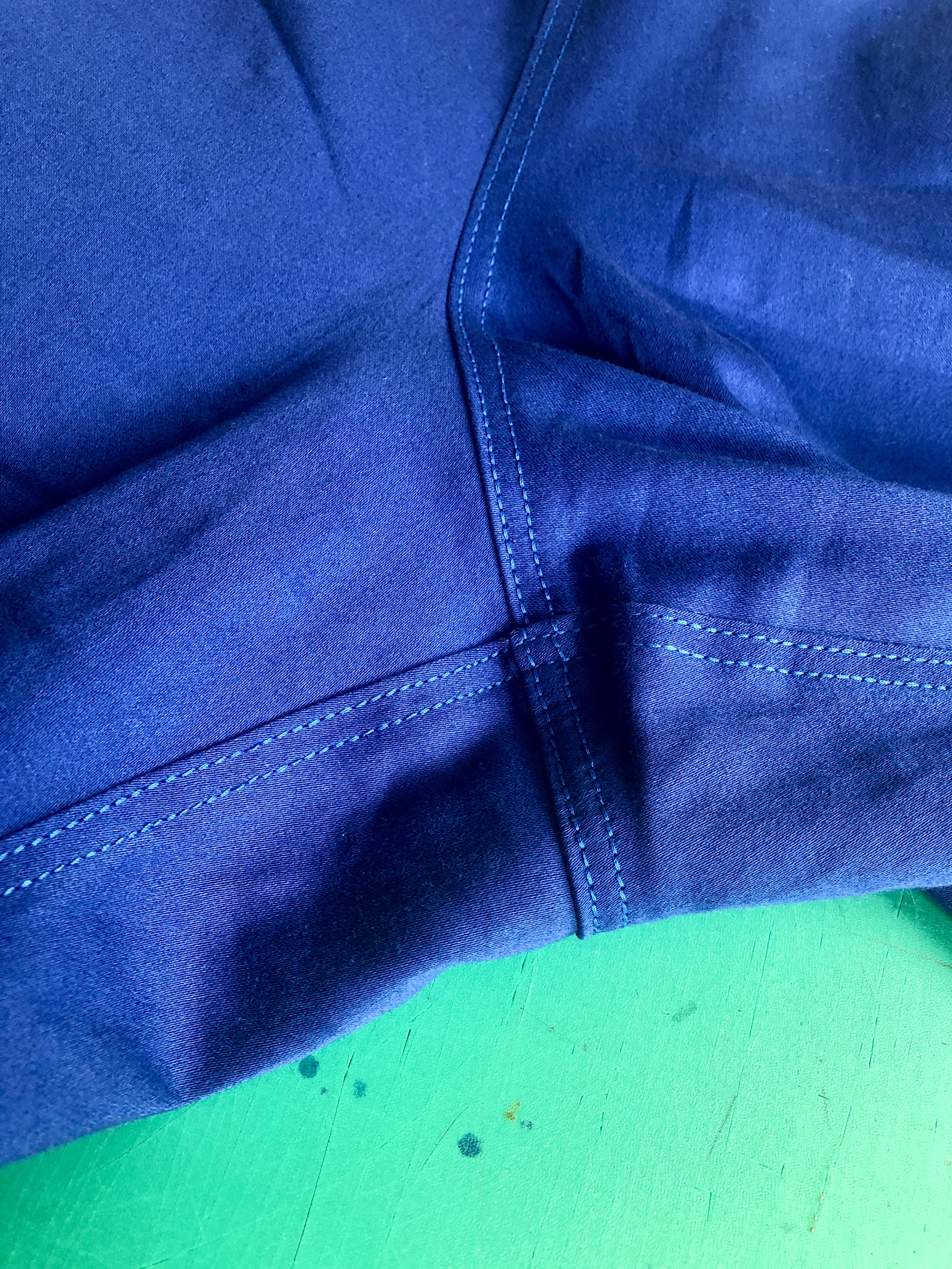 I made the blue and white striped top knowing I was going to be making these trousers, but I’m not sure it goes best with this vivid blue. The Arden pants is a great pattern with lots of lovely top stitching. I have been making it with this type of cotton sateen with 3% lycra and they are so comfortable!