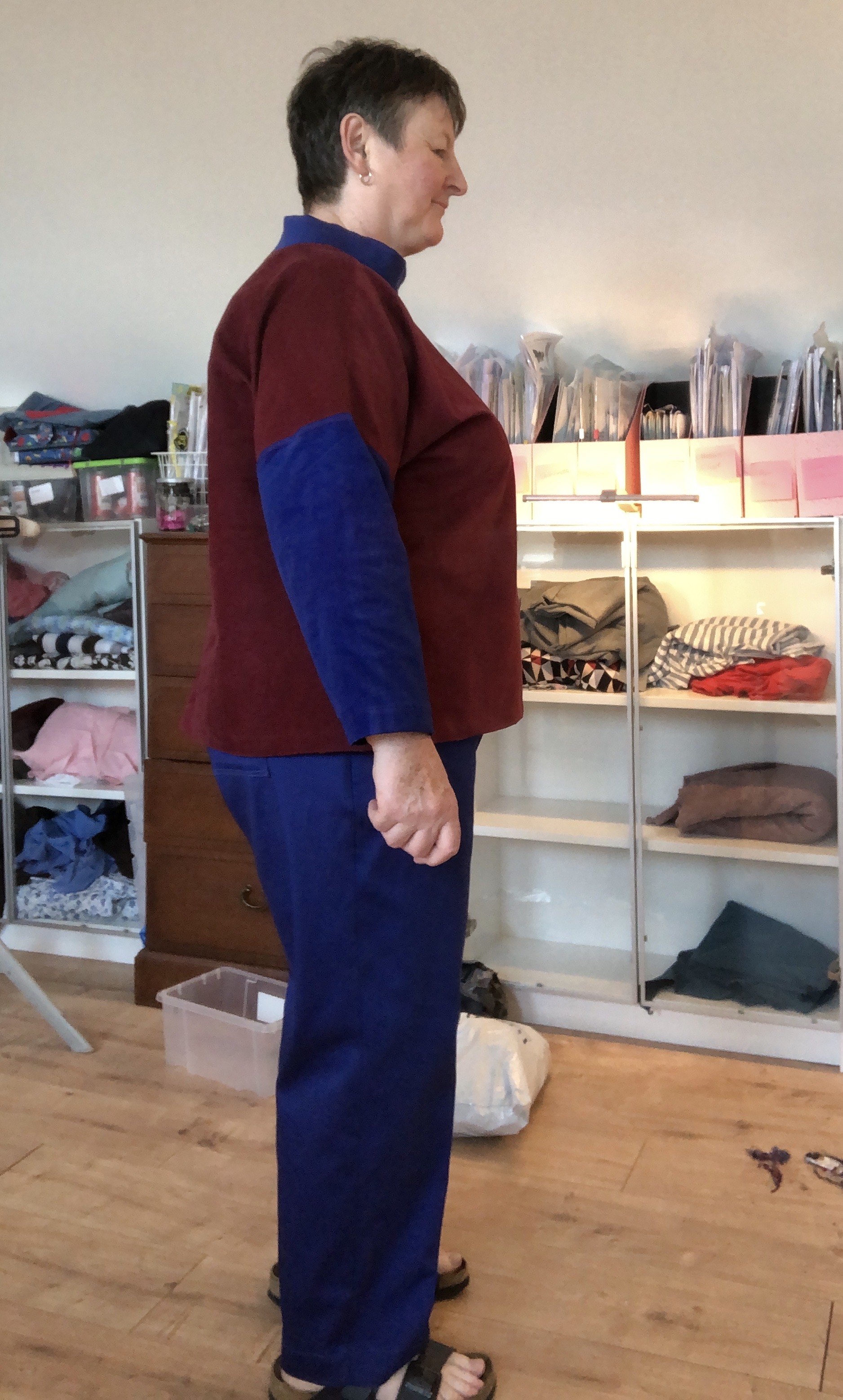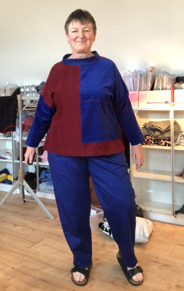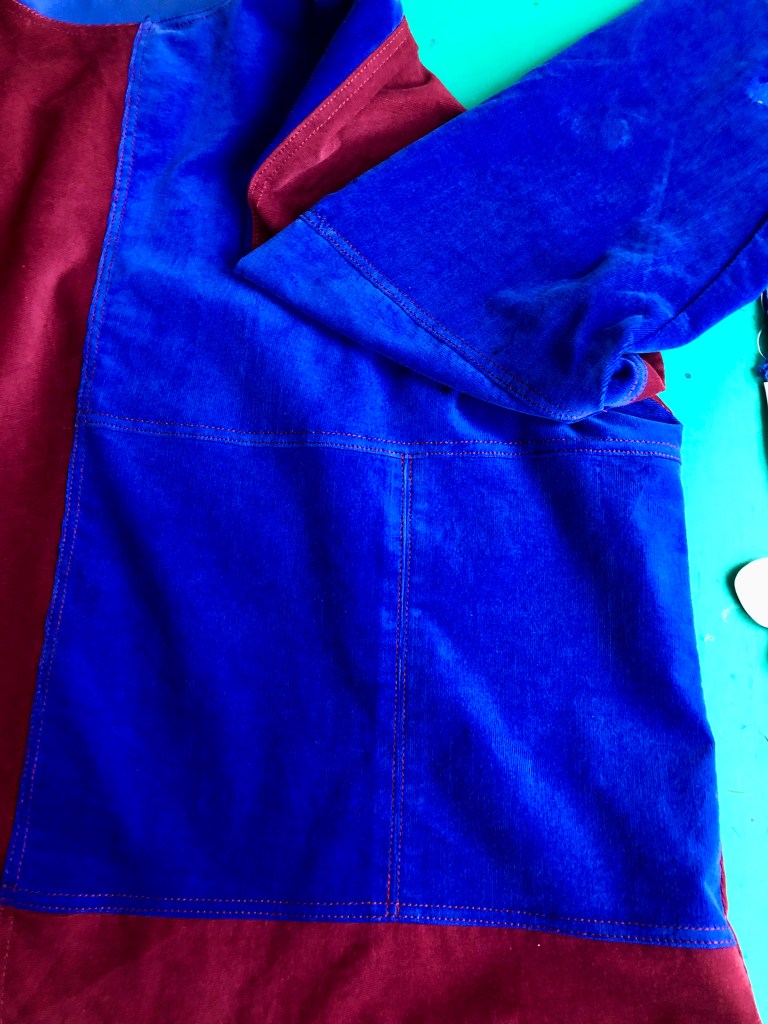 I had some fun working out how to do it. I added centre seams to the front and back. And half the front is made up of three blue pieces and one of the dark red patched together. This cord has a one-way stretch, but I didn’t worry about that, or the nap, when piecing it together. I did have to trim the ends of some seams as I went along – where a non-stretch bit met a stretch bit.