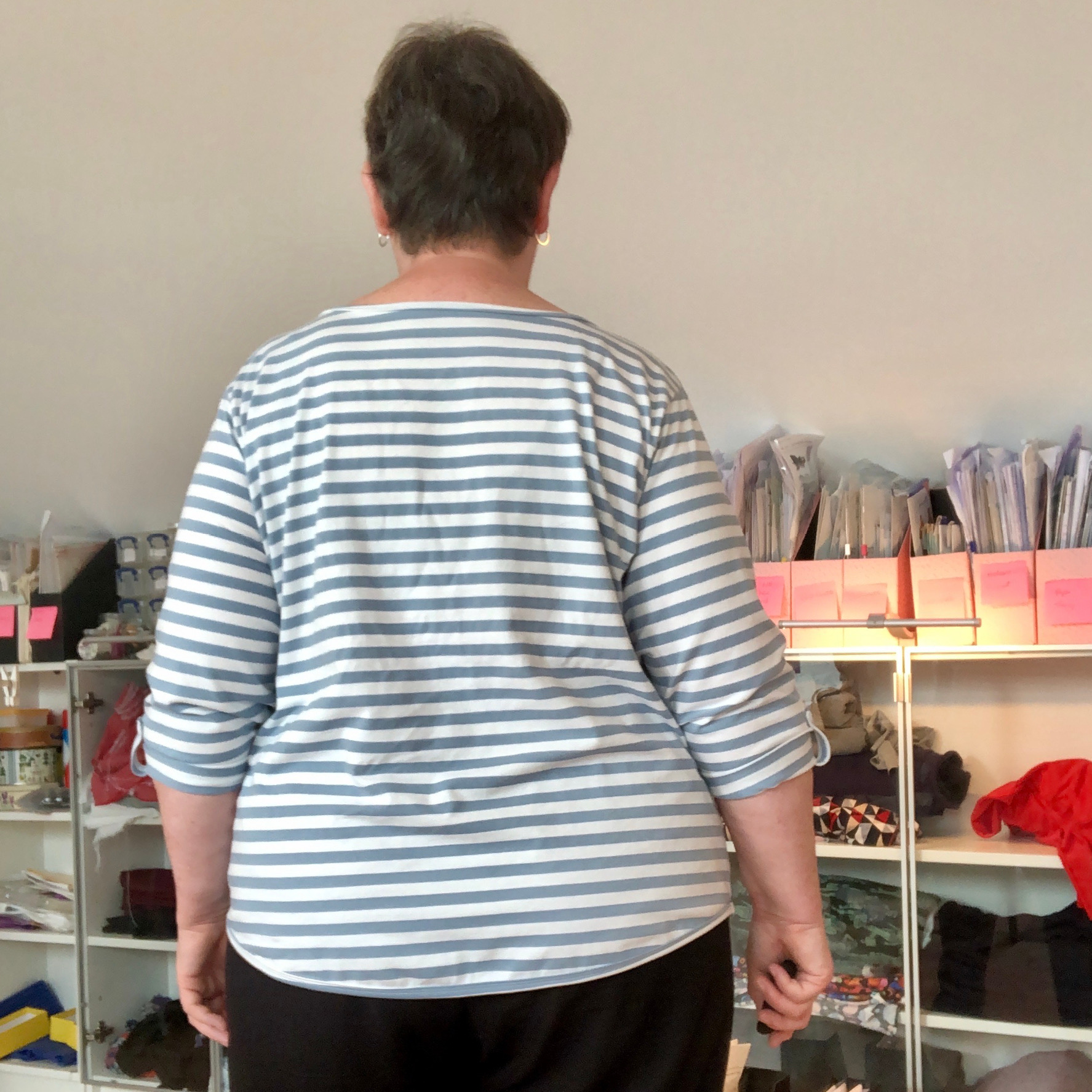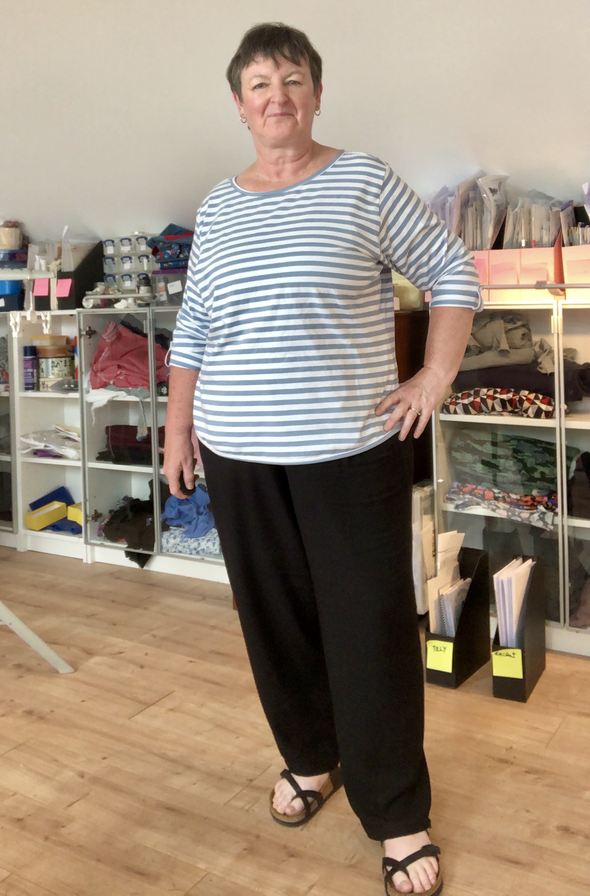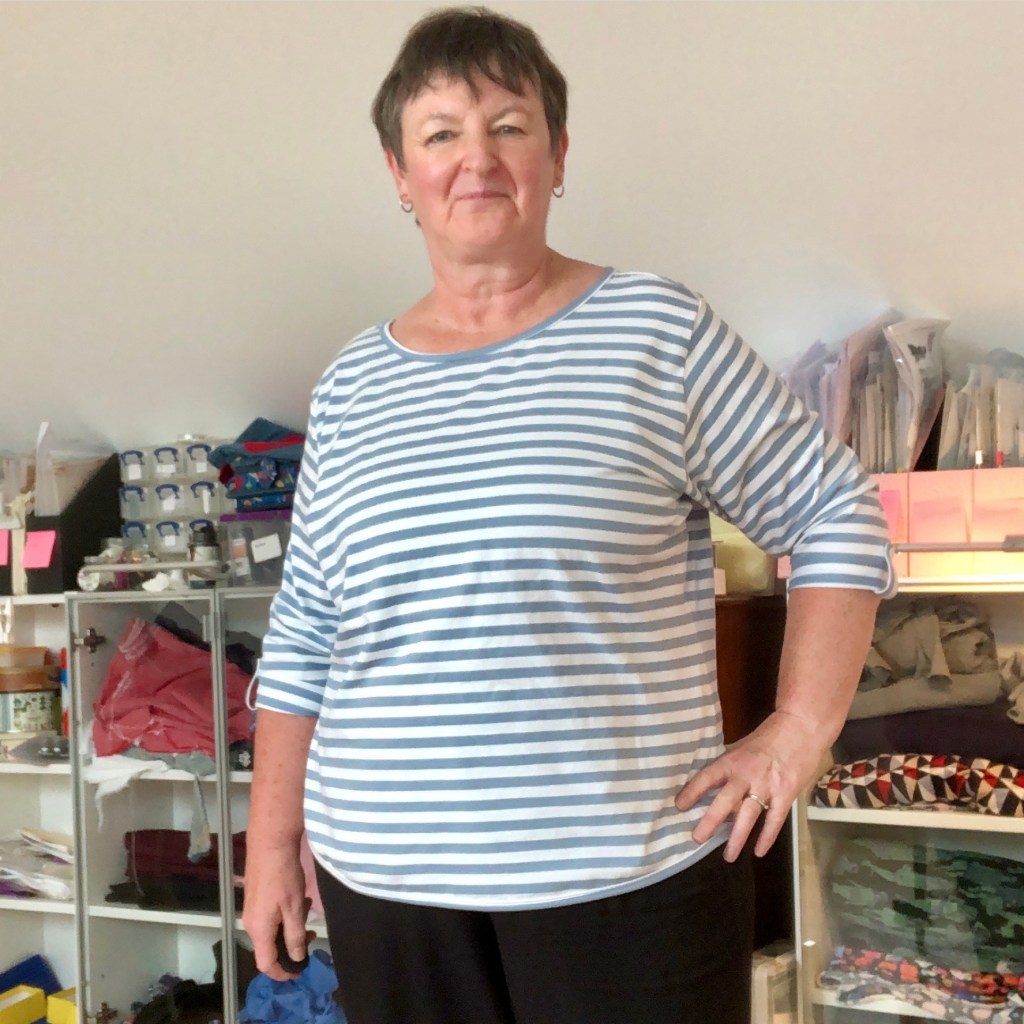 I haven’t made at T for a while and I also wanted to make one for the forthcoming ‘Sewing Lovers Ireland’ t-shirt challenge. This is the Eva Tee from Pattern Union (https://www.patternunion.com.au/product-page/eva-tee). I think it worked out okay. However, when it was finished the sleeves were much too long and a bit tight towards the wrists – fine for once on the biceps! I dealt with this by slicing 6” off the sleeve length and this left me with just two folds to turn over and secure with the tab. It also meant the sleeve ended at a wider point.