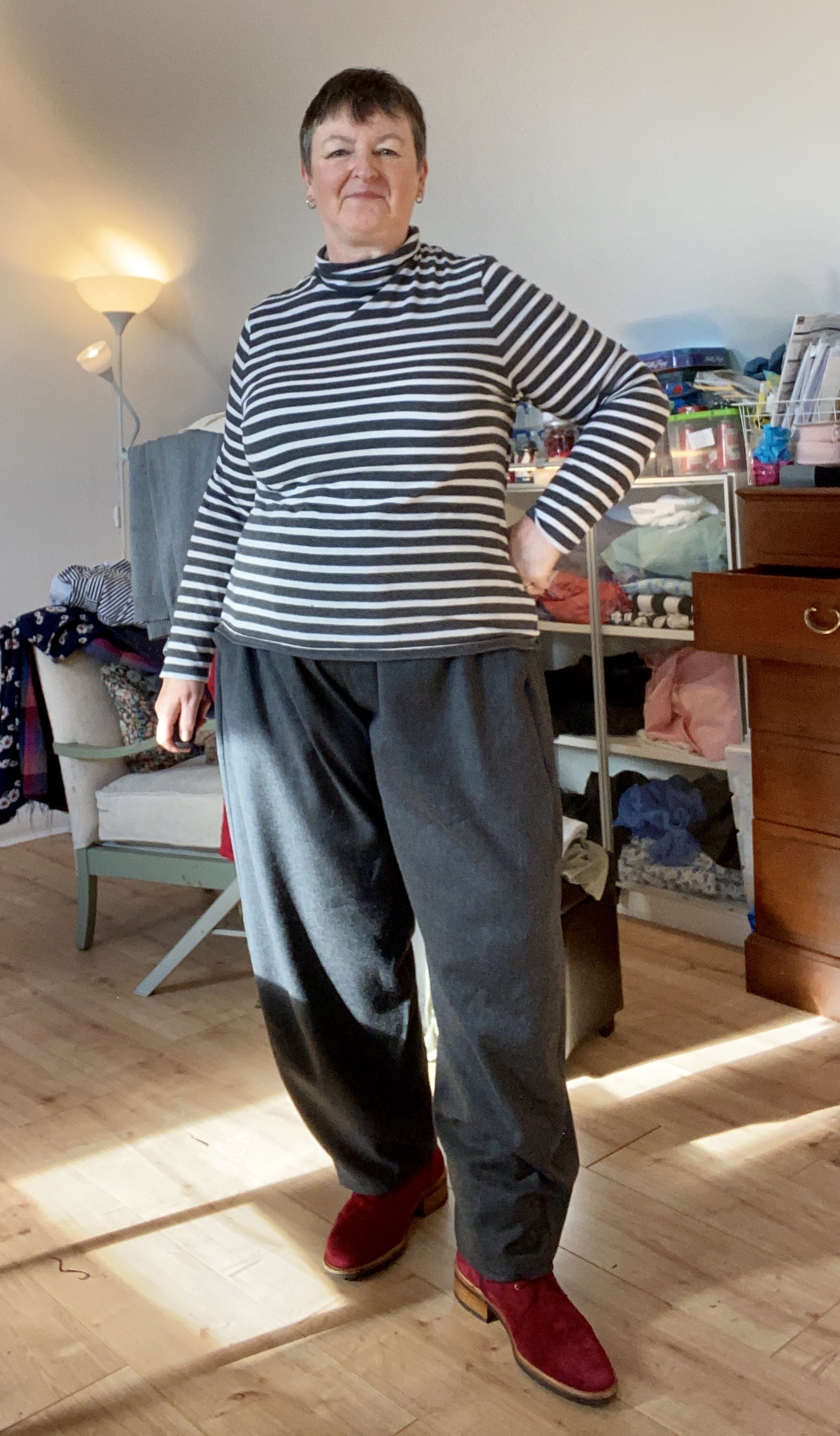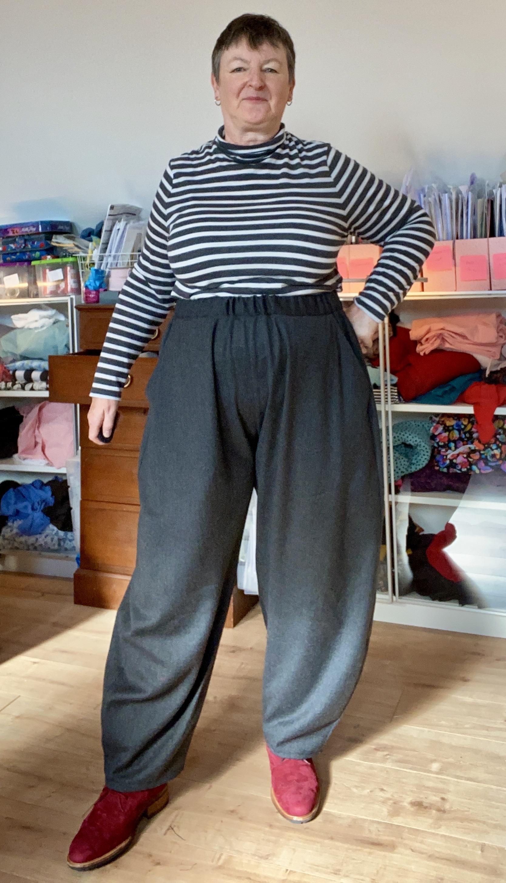 This pattern has been unused in my pattern stash for quite a well. I had been a bit scared of the funky shape on my curvy size. This wool is described as non-itchy so I was confident I wouldn’t need a lining and having tried them on and worn them for an hour or so, I can say they don’t feel itchy at all. The fabric is beautifully fluid and I think the unique shape of the Bob pants matches well with the the sober fabric.