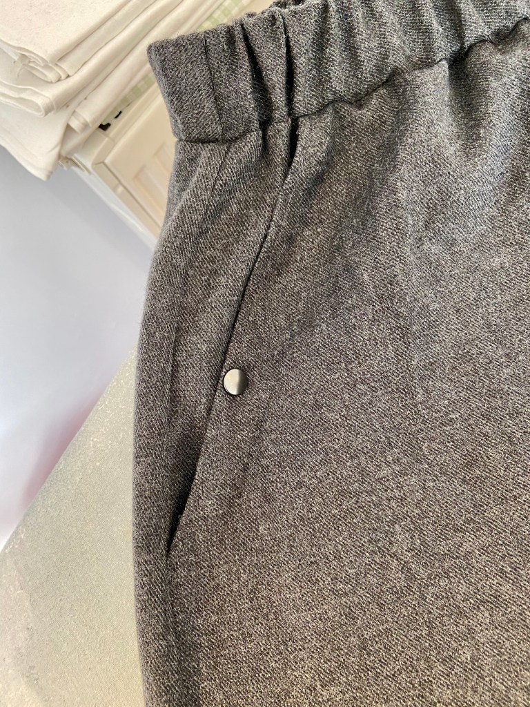 And I made slash pockets so I could secure them at the waist. I generally don’t like in-seam pockets as provided in the pattern. However, even though I interfaced the edges they do gape a little, so I added a hammer-on snap to each of them to keep them tidy. I used Liberty Tana lawn in the pocket lining. I might change the way I do the pockets the next time. I did my usual way of adding the waistband, by sewing it on then threading the elastic through. The pattern instructions get you to sew the elastic to the waistband first. I don’t see the logic in that.