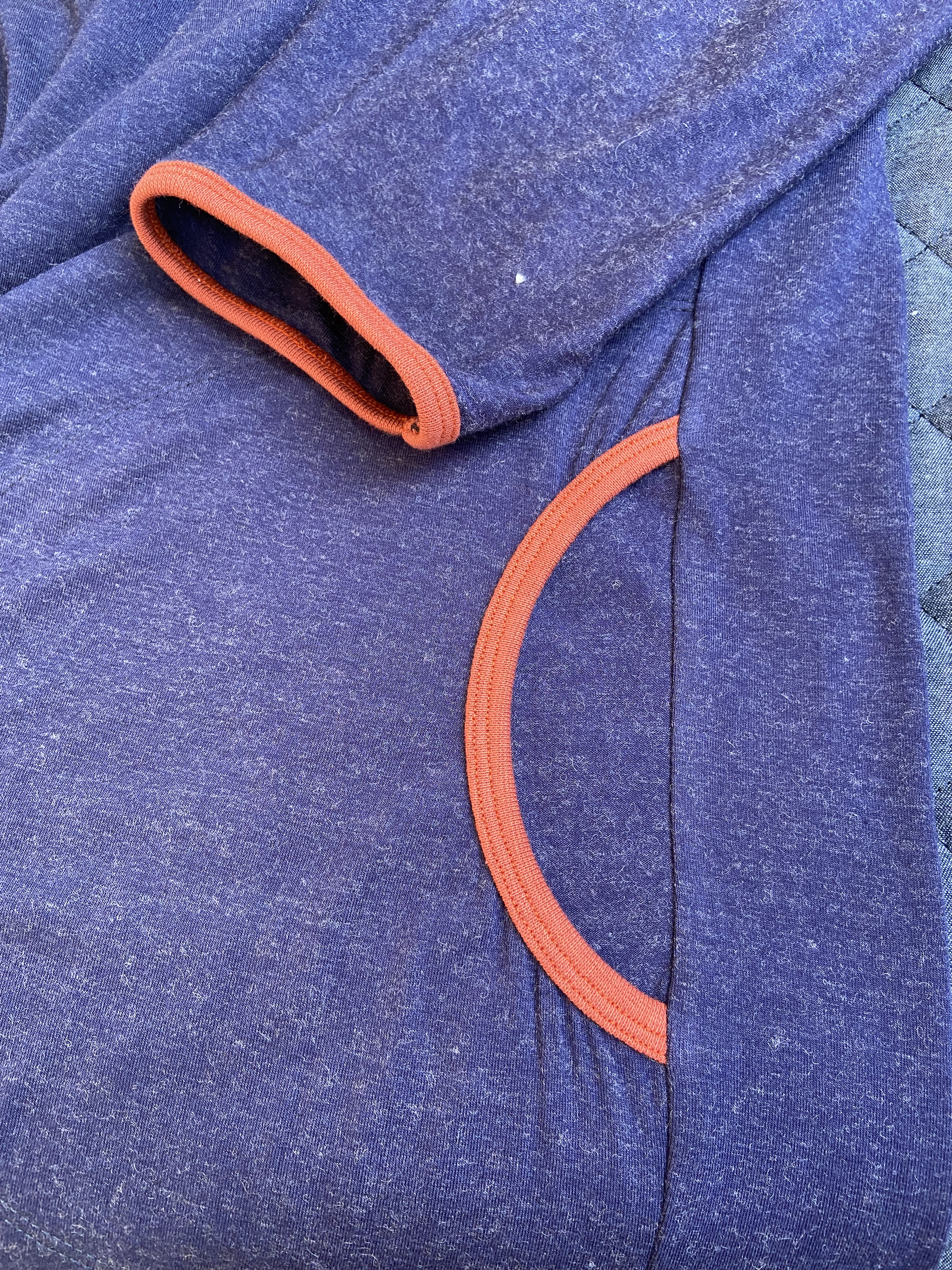 I bound the pockets and the sleeves using the binder attachment on my Coverstitch. I find this very easy with knit fabrics, but I often have trouble using the binder on wovens.