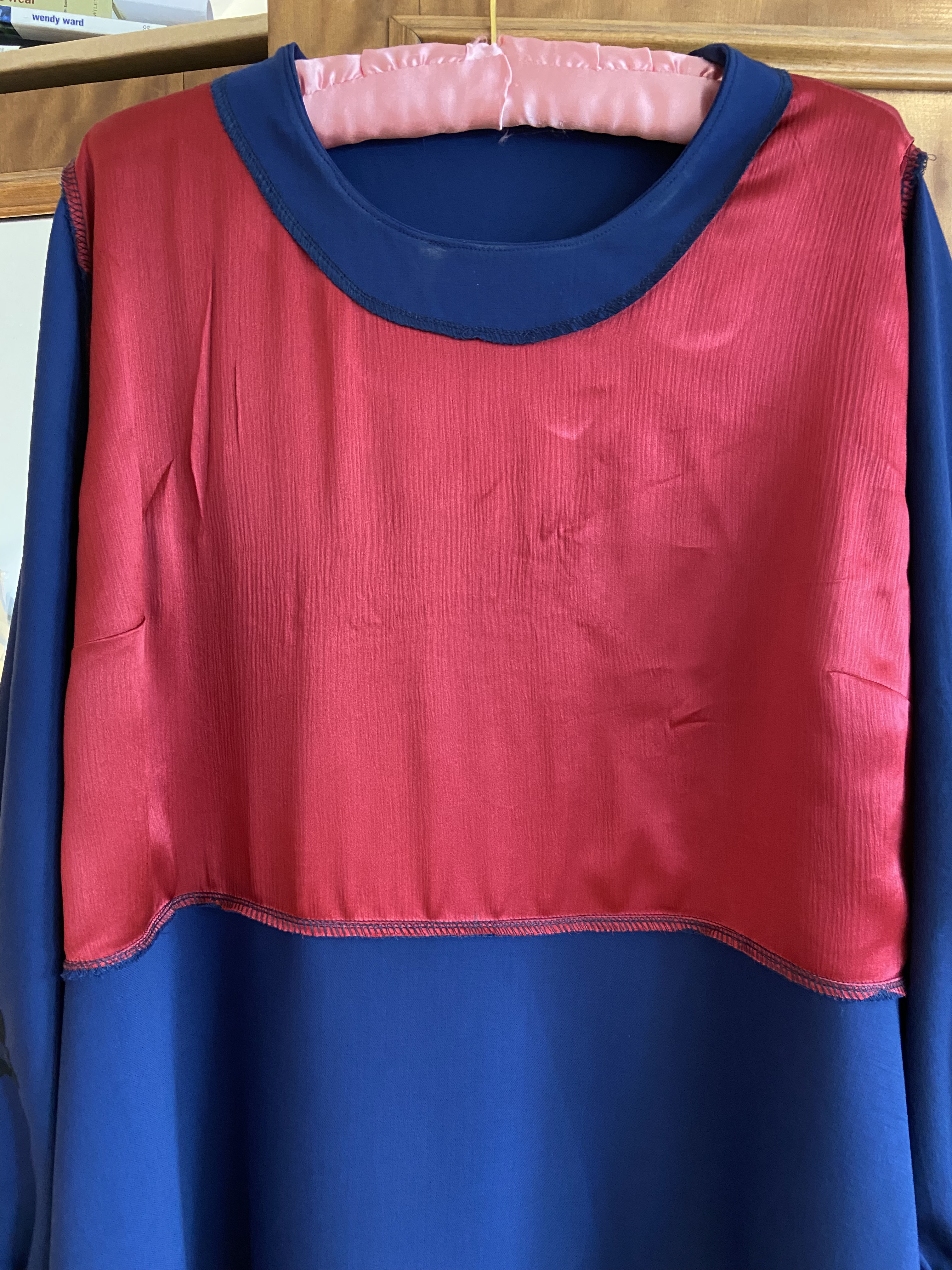 Instead of topstitching the cuff at the wrist, I stitched it in the ditch as I didn’t want machine stitching too obvious; and I did a blind hem on the skirt. To gather the sleeves at the cuffs I used swim elastic. I left a tail on the elastic, marked the length of the cuff; left another tail and marked it for the second cuff. I added the elastic to the sleeve on my serger, stretching the elastic as I went. This made this job really easy, I wouldn’t fancy gathering all that wool with thread.