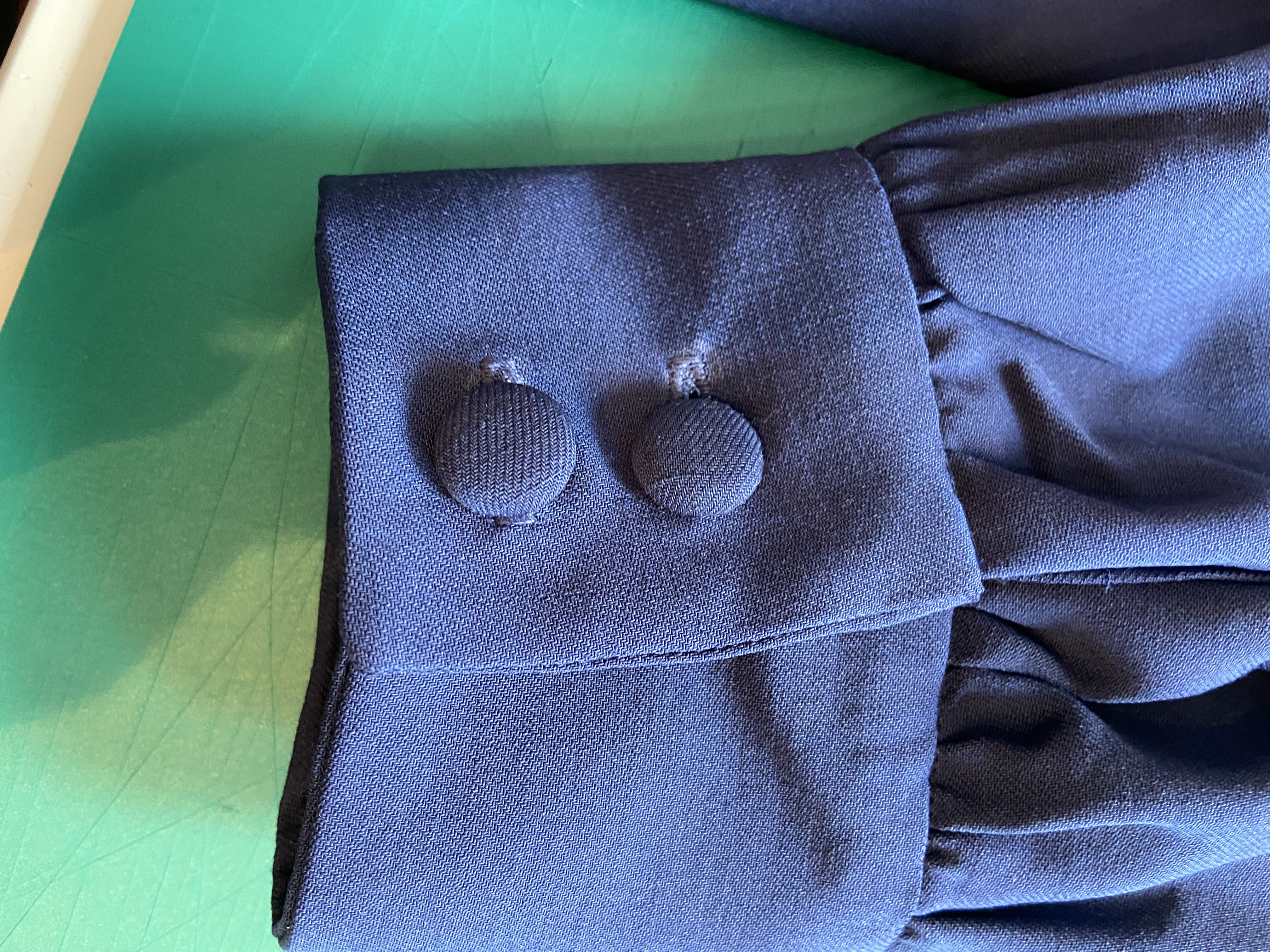 I should have used dark interfacing on the wrists instead of the white, because some white threads are showing through on the buttonholes. Lesson learned!