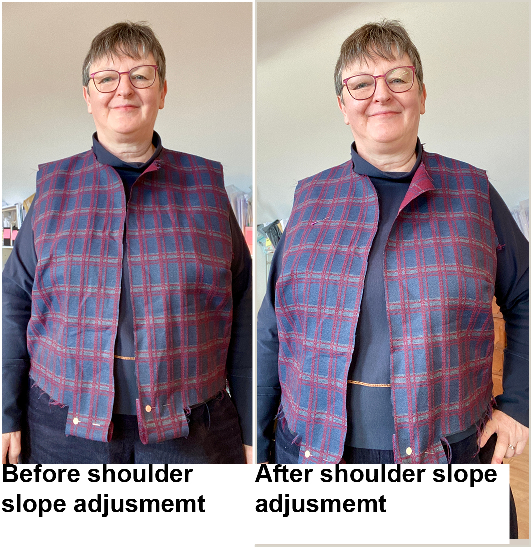 I also did a forward shoulder adjustment. In the second pic I then added a sloping shoulder adjustment. I made this adjustment first to the pattern and then to my muslin (having ripped the shoulder seams). If I don’t do this I get totally lost! (The other pics are before I did the shoulder slope adjustment)