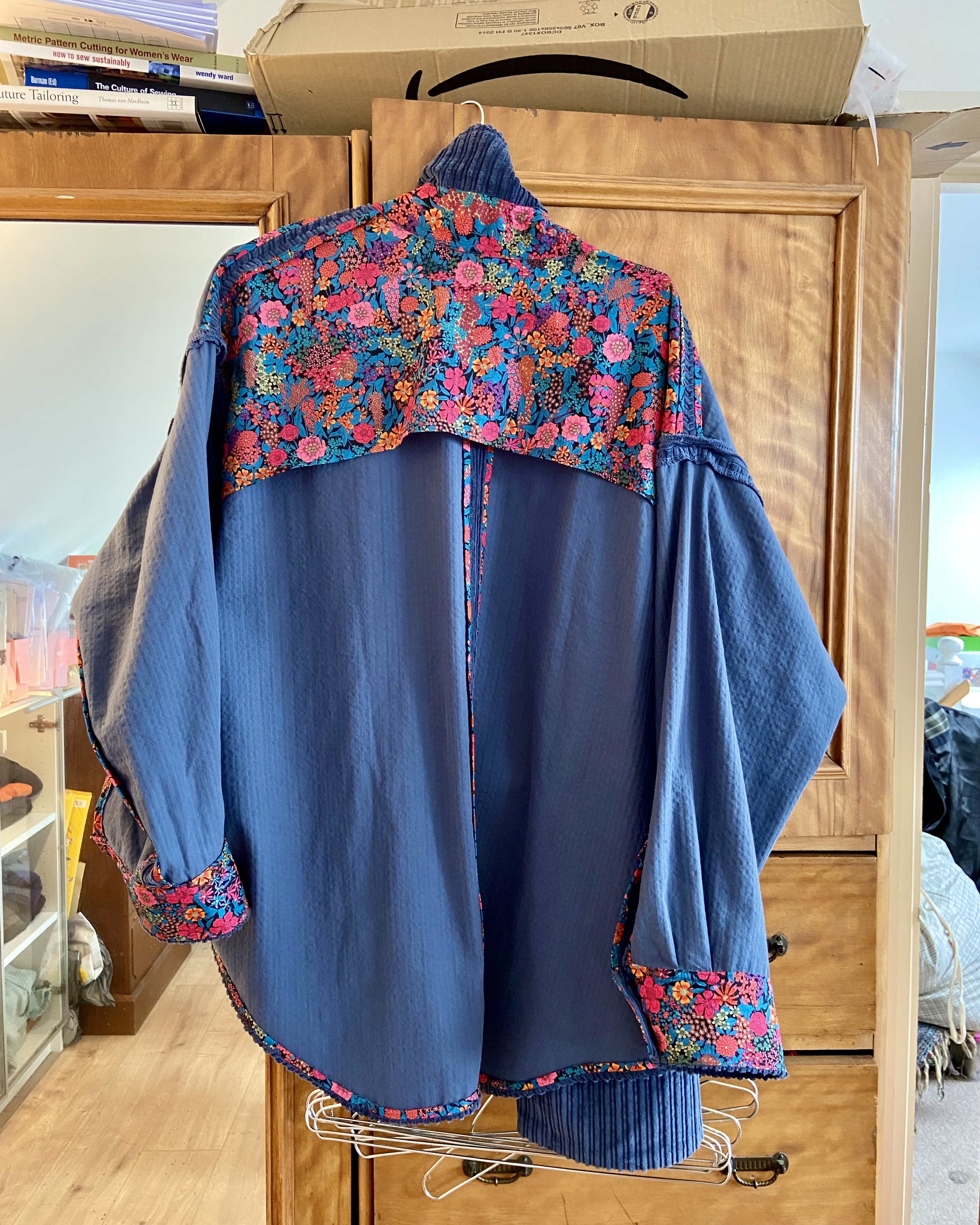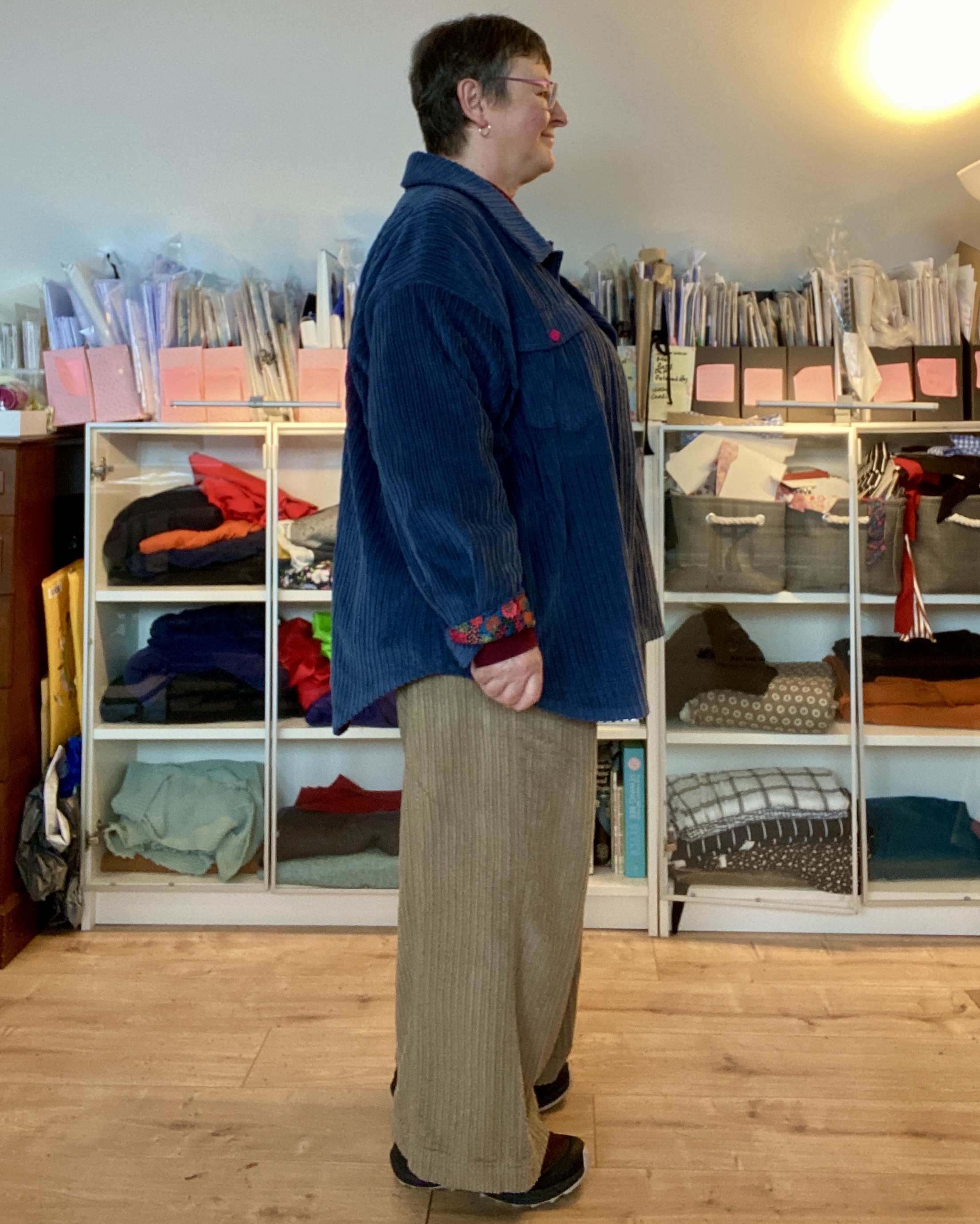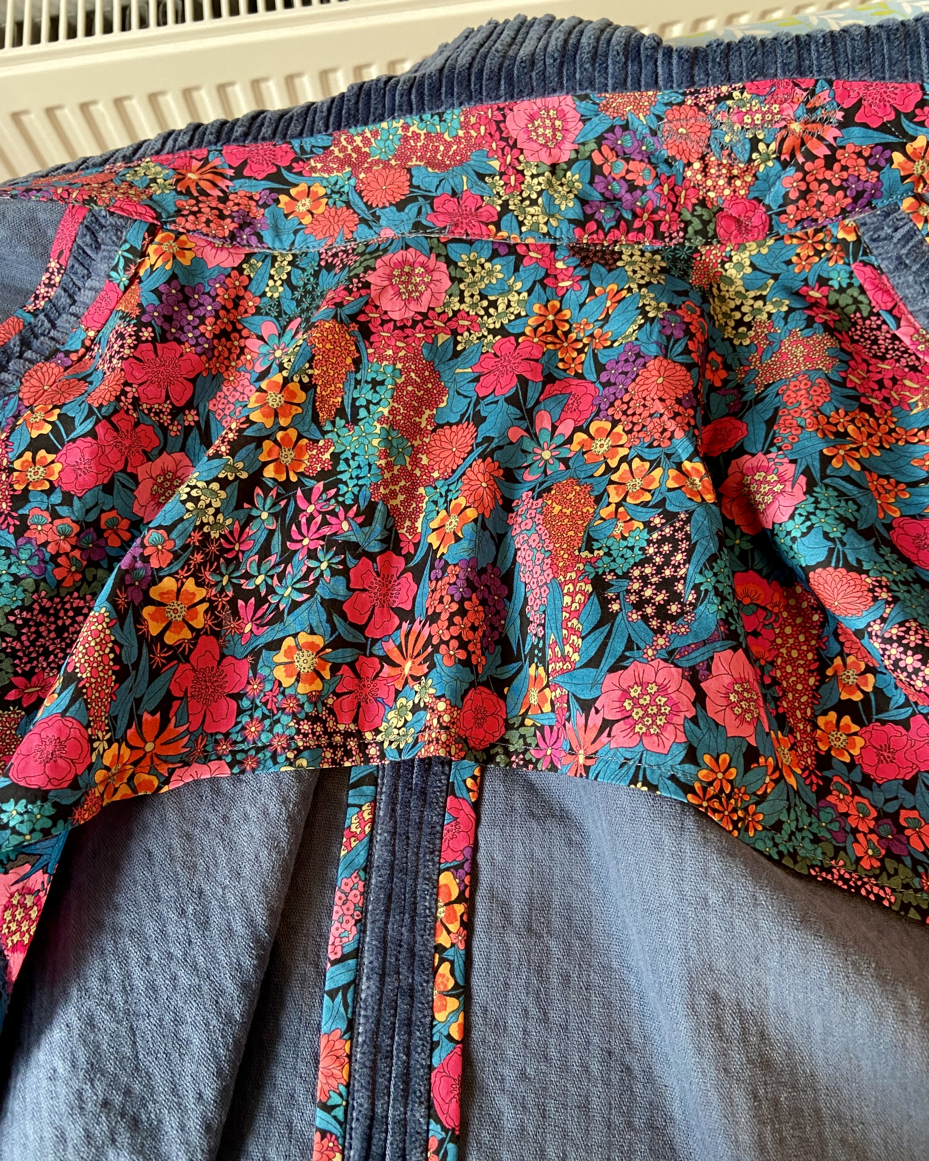 I shortened the Shacket 5.5 inches and used the shirttail shapes from the Tarawi. I added pockets based on the M&B Lobethal Shirt. The fabric in this shirt is 100% heavyish, but oh so soft, corduroy. That’s why I used the Shacket instead of the Tarawi. The Shacket pattern is designed for heavyish fabrics and the construction takes account of this by using lining in strategic places to reduce bulk. My lining fabric is Liberty Tana Lawn, left over from lining a recent coat. There are only tiny scraps left now.