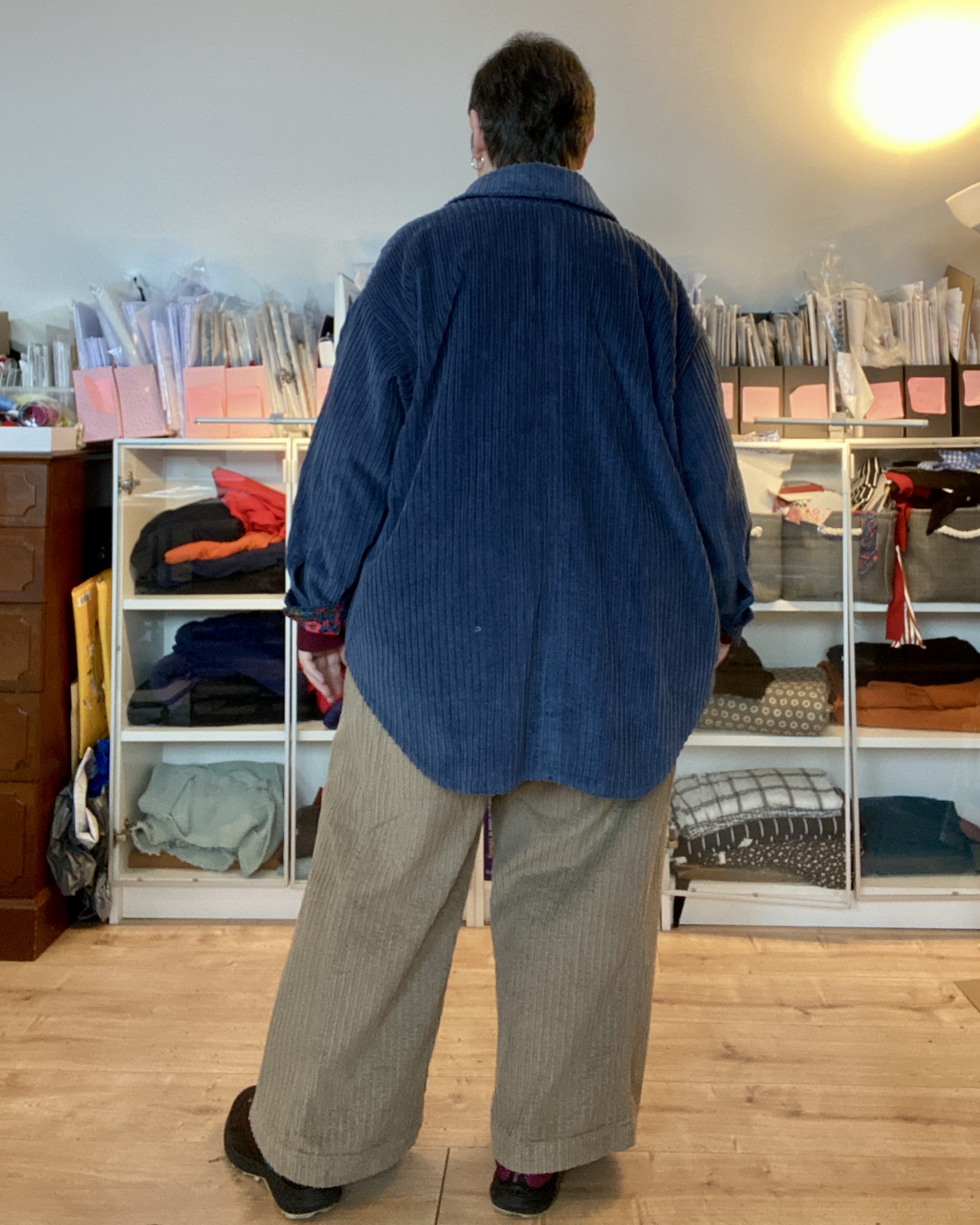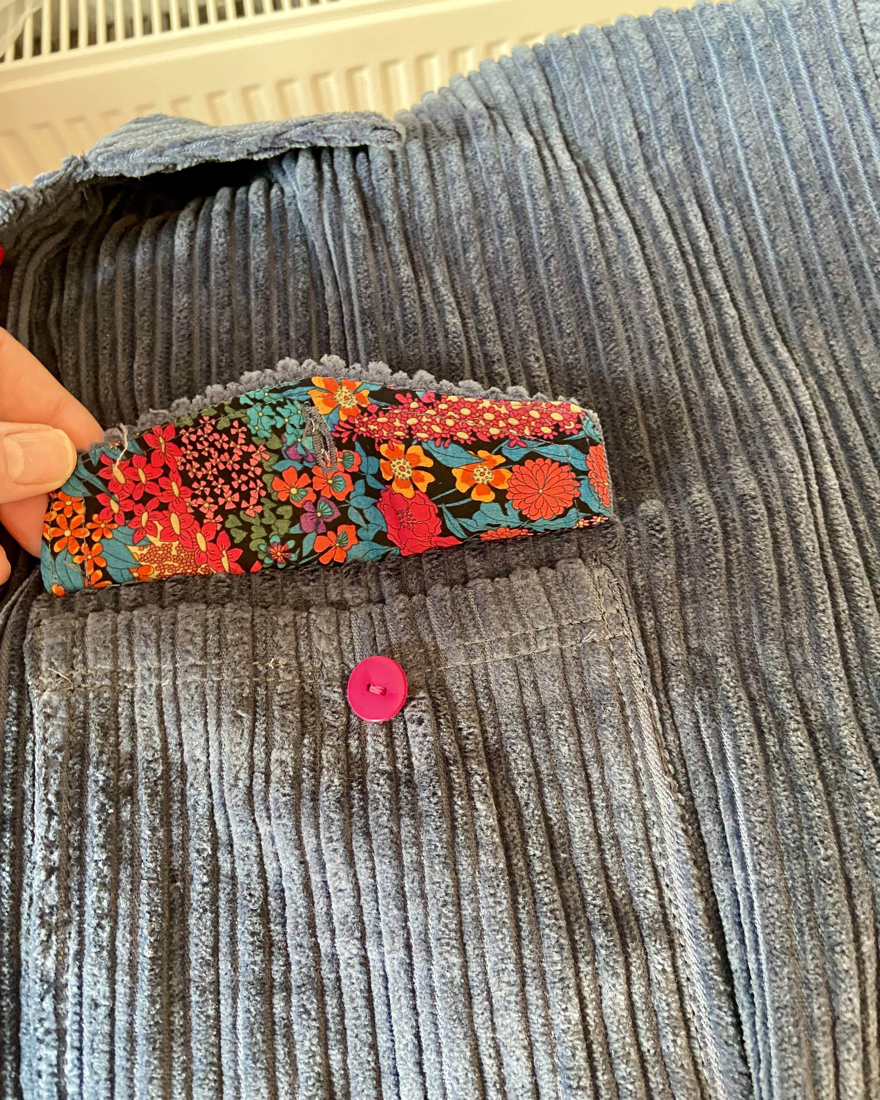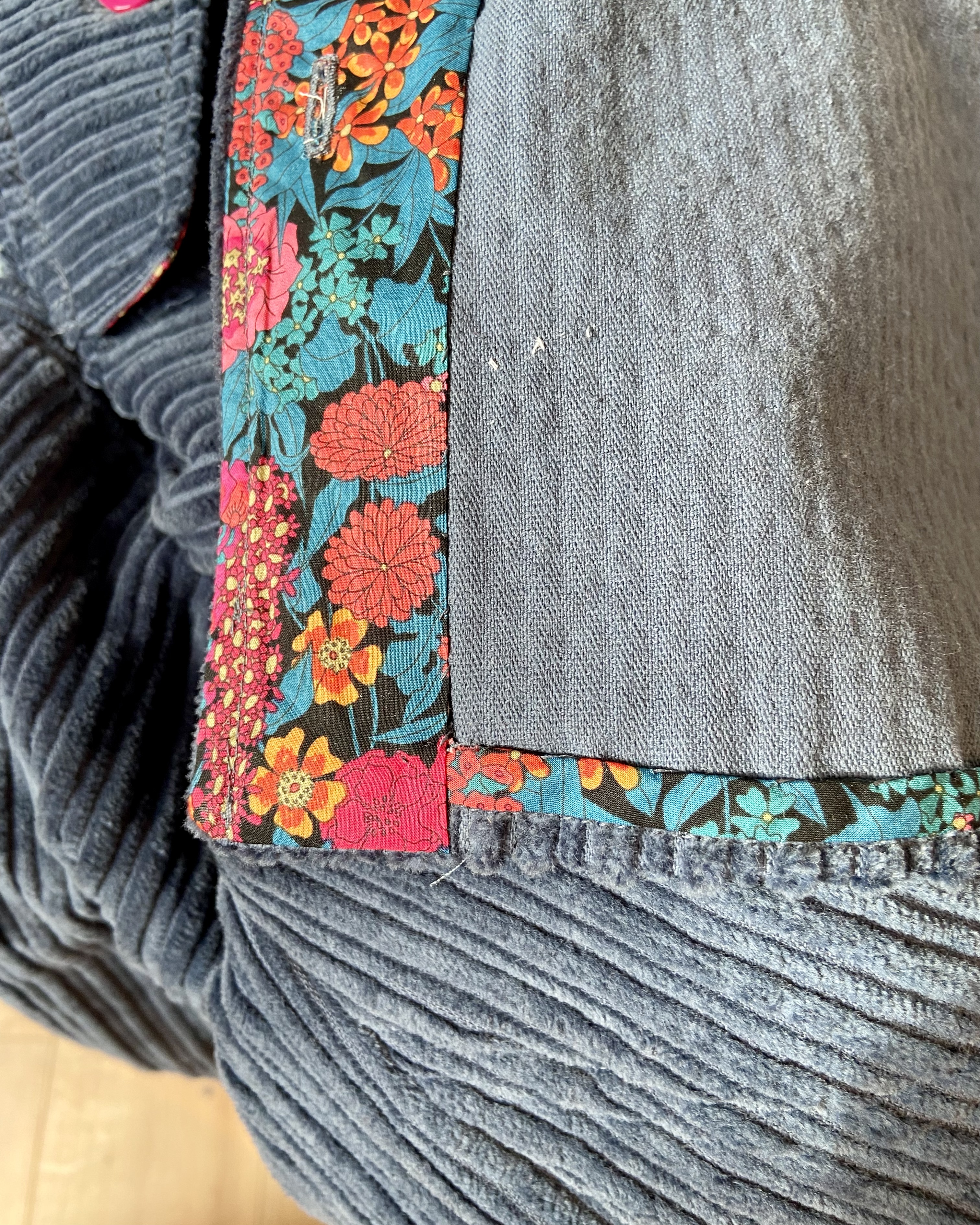 I shortened the Shacket 5.5 inches and used the shirttail shapes from the Tarawi. I added pockets based on the M&B Lobethal Shirt. The fabric in this shirt is 100% heavyish, but oh so soft, corduroy. That’s why I used the Shacket instead of the Tarawi. The Shacket pattern is designed for heavyish fabrics and the construction takes account of this by using lining in strategic places to reduce bulk. My lining fabric is Liberty Tana Lawn, left over from lining a recent coat. There are only tiny scraps left now.